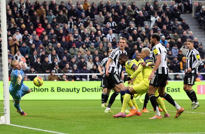 但他腾空而起,踢出了一记倒钩射门。纽卡斯尔的防守球员们似乎被如此大胆的举动惊得僵住了。乔、法比安-舍尔、丹-伯恩和尼克-沃尔特马德都呆立原地。唯一在动的是皮球,它穿过这四名球员,滚入了球门底角。